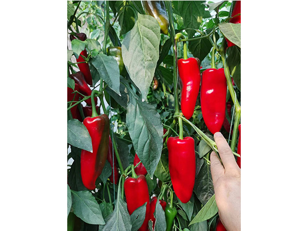 杂交一代,红椒专用辣椒新品种。该品种早熟,叶色绿,生长健壮,红果亮红色,鲜艳美丽,光泽度好,硬度好,耐运输,不易变软,微辣,商品性好。